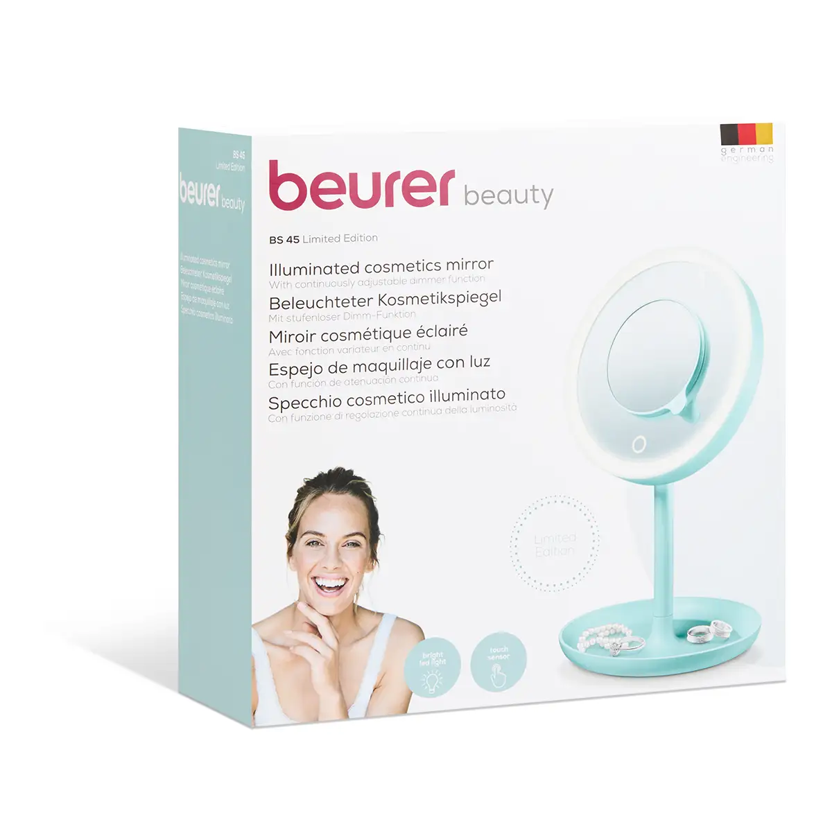 Der Beurer BS 45 Beleuchteter Kosmetikspiegel unterstützt Ihre tägliche Gesichtspflege und sorgt für ein strahlendes Aussehen. Der helle LED-Lichtring mit 28 LEDs spendet ein stufenlos dimmbares Licht, das sich ideal zum Auftragen von Make-up eignet. Nach 15 Minuten schaltet sich das Licht automatisch ab, um die Batterien zu schonen und die Betriebszeit zu verlängern.