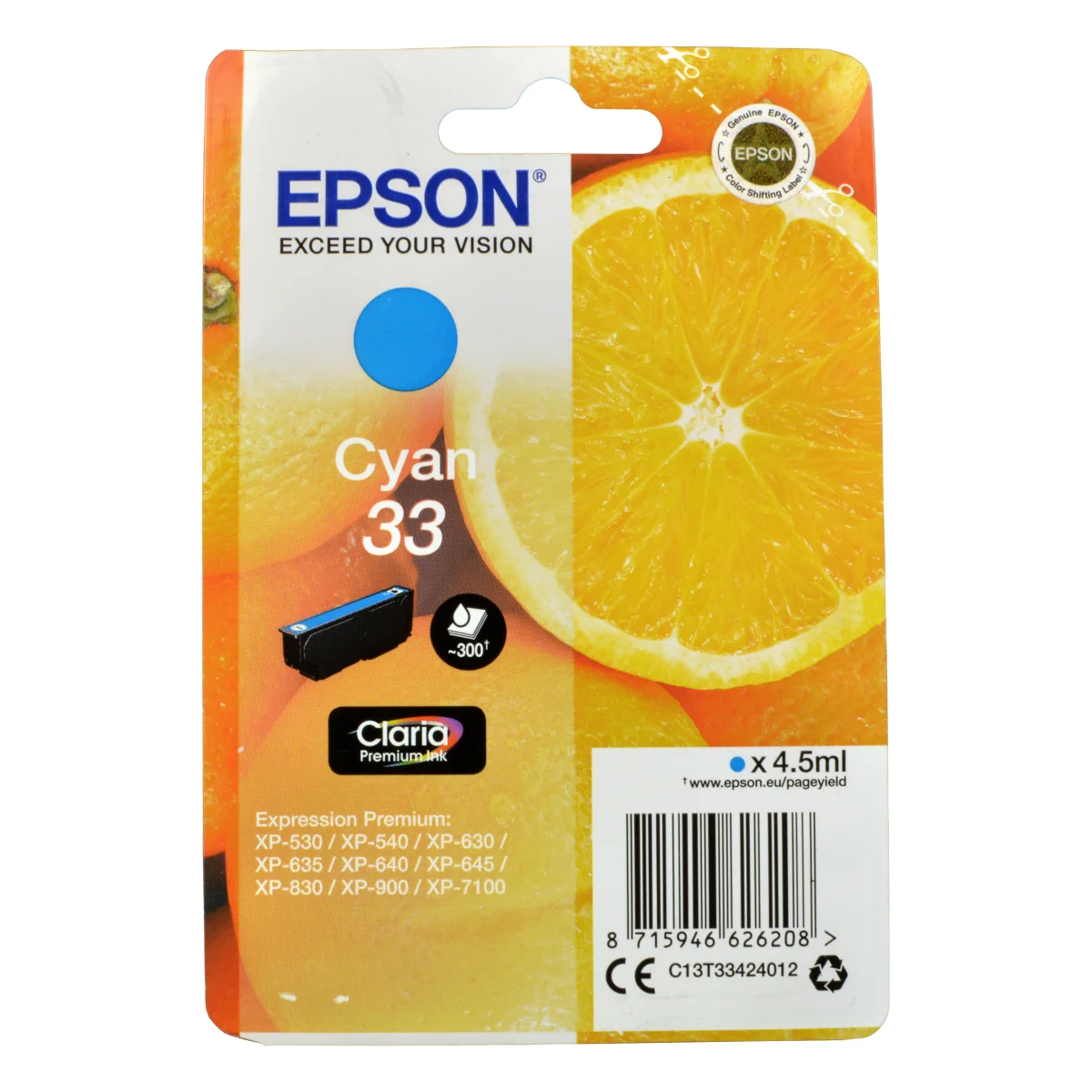 Epson Oranges Singlepack Cyan 33 Claria Premium Ink. Typ: Original, Druckfarben: Cyan, Markenkompatibilität: Epson. Verpackungsbreite: 145 mm, Verpackungstiefe: 26 mm, Verpackungshöhe: 102 mm. Palettenbreite: 80 cm, Palettenlänge: 120 cm, Palettenhöhe: 39 cmMit separaten Einzelpatronen von Epson bis zu 30 % Tinte2 sparen