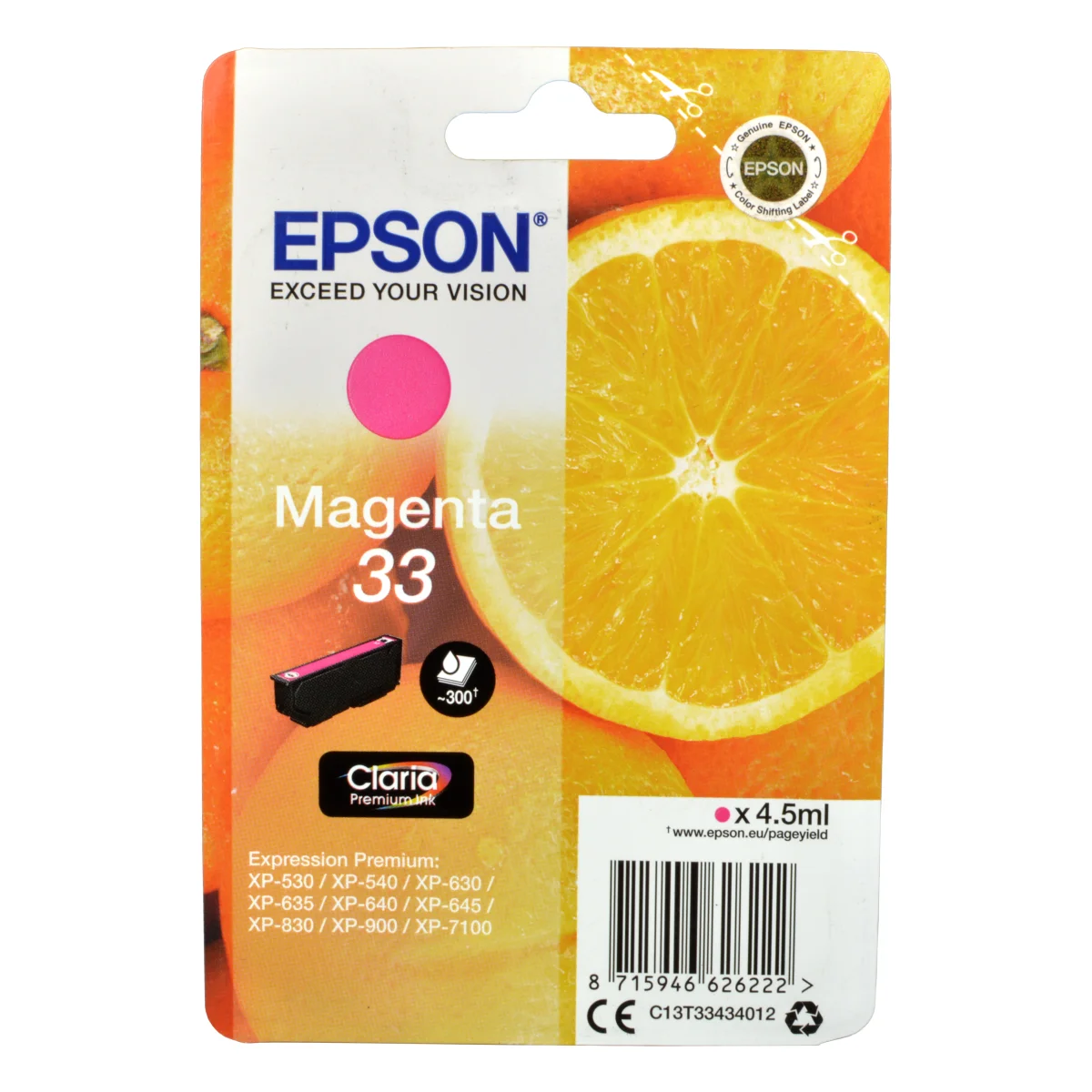 Epson Oranges Singlepack Magenta 33 Claria Premium Ink. Typ: Original, Tintentyp: Tinte auf Pigmentbasis, Druckfarben: Magenta. Verpackungsbreite: 145 mm, Verpackungstiefe: 26 mm, Verpackungshöhe: 102 mm. Palettenbreite: 80 cm, Palettenlänge: 120 cm, Palettenhöhe: 39 cmMit separaten Einzelpatronen von Epson bis zu 30 % Tinte2 sparen