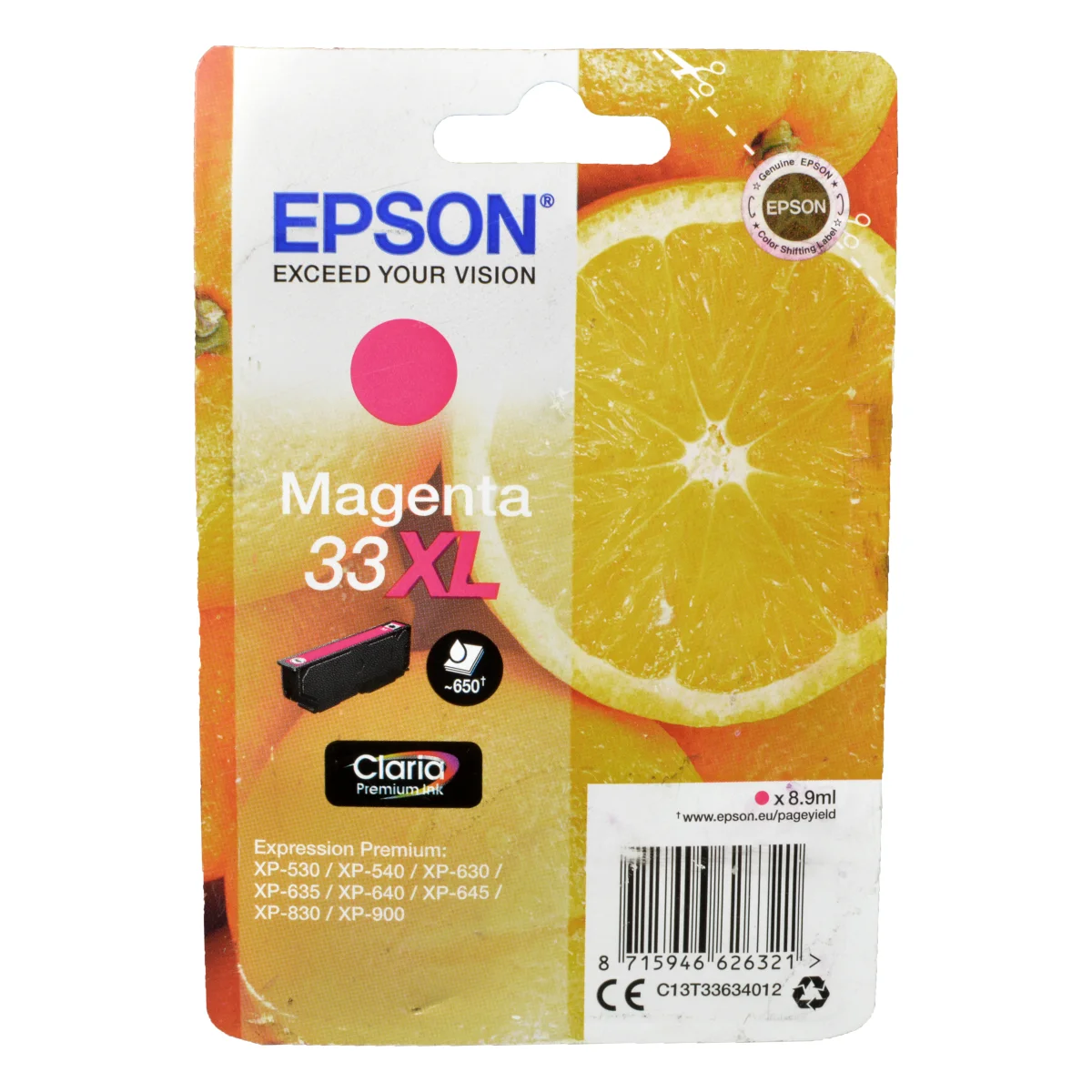 Epson Oranges Singlepack Magenta 33XL Claria Premium Ink. Typ: Original, Tintentyp: Tinte auf Pigmentbasis, Druckfarben: Magenta. Verpackungsbreite: 145 mm, Verpackungstiefe: 26 mm, Verpackungshöhe: 102 mm. Palettenbreite: 80 cm, Palettenlänge: 120 cm, Palettenhöhe: 55 cmMit separaten Einzelpatronen von Epson bis zu 30 % Tinte2 sparen