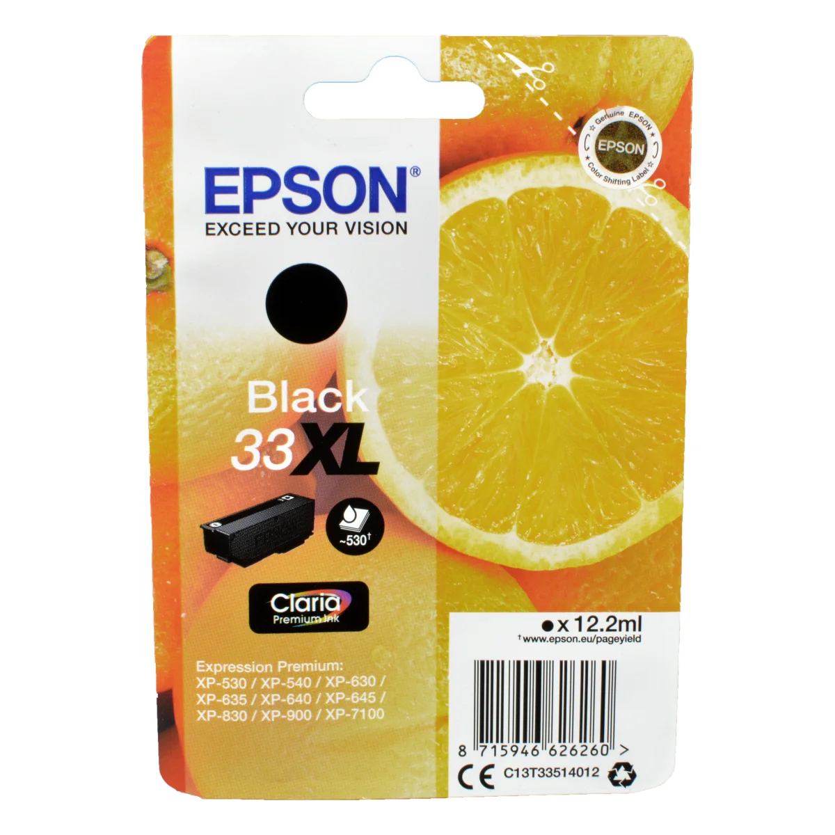 Epson Oranges Singlepack Black 33XL Claria Premium Ink. Typ: Original, Tintentyp: Tinte auf Pigmentbasis, Druckfarben: Schwarz. Verpackungsbreite: 150 mm, Verpackungstiefe: 43 mm, Verpackungshöhe: 102 mm. Palettenbreite: 80 cm, Palettenlänge: 120 cm, Palettenhöhe: 55 cmMit separaten Einzelpatronen von Epson bis zu 30 % Tinte2 sparen
