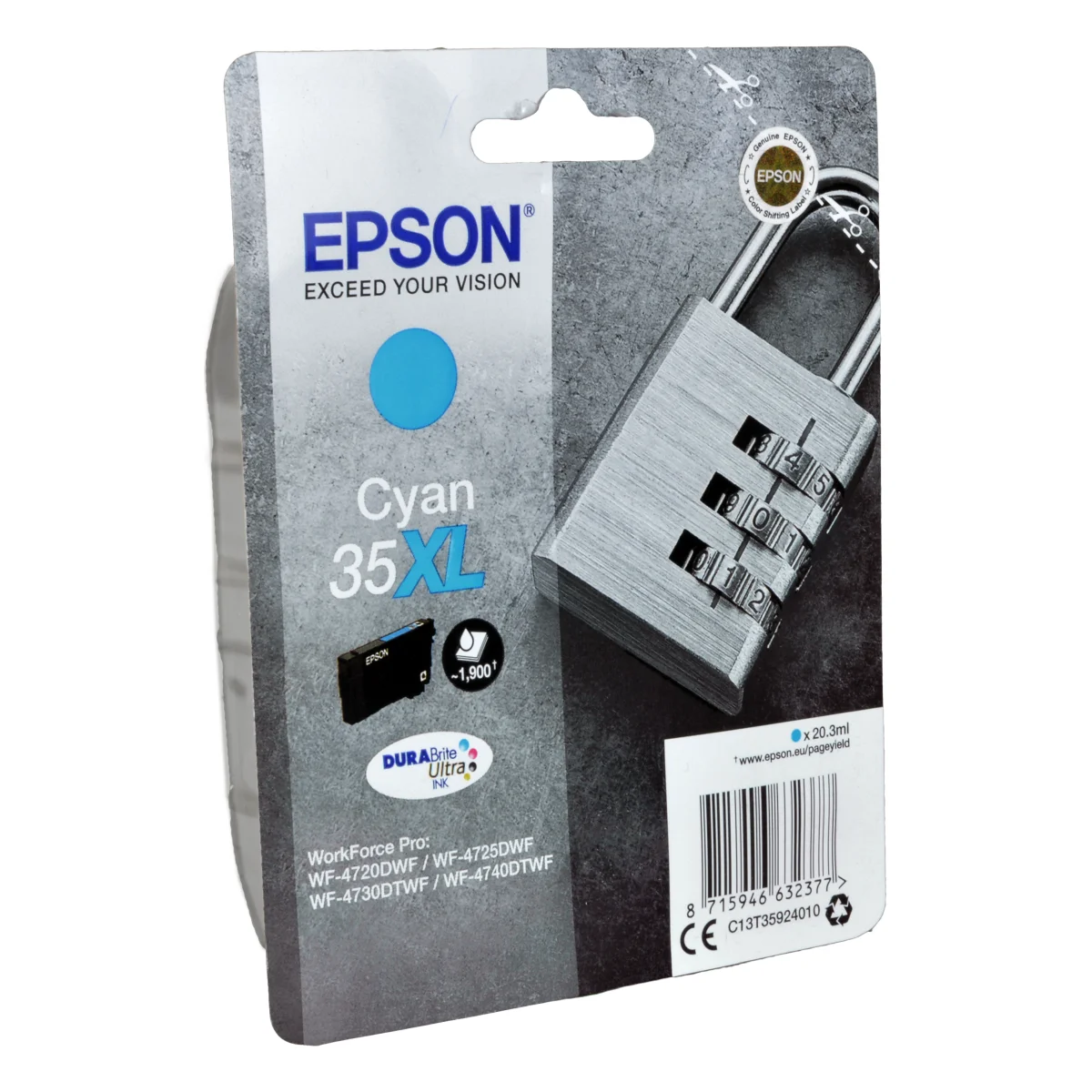 Epson Padlock Singlepack Cyan 35XL DURABrite Ultra Ink. Typ: Original, Druckfarben: Cyan, Markenkompatibilität: Epson. Verpackungsbreite: 145 mm, Verpackungstiefe: 33 mm, Verpackungshöhe: 120 mm. Menge pro Palette: 2400 Stück(e), Breite des Versandkartons: 12 cm, Länge des Versandkartons: 26 cmGeringere Druckkosten