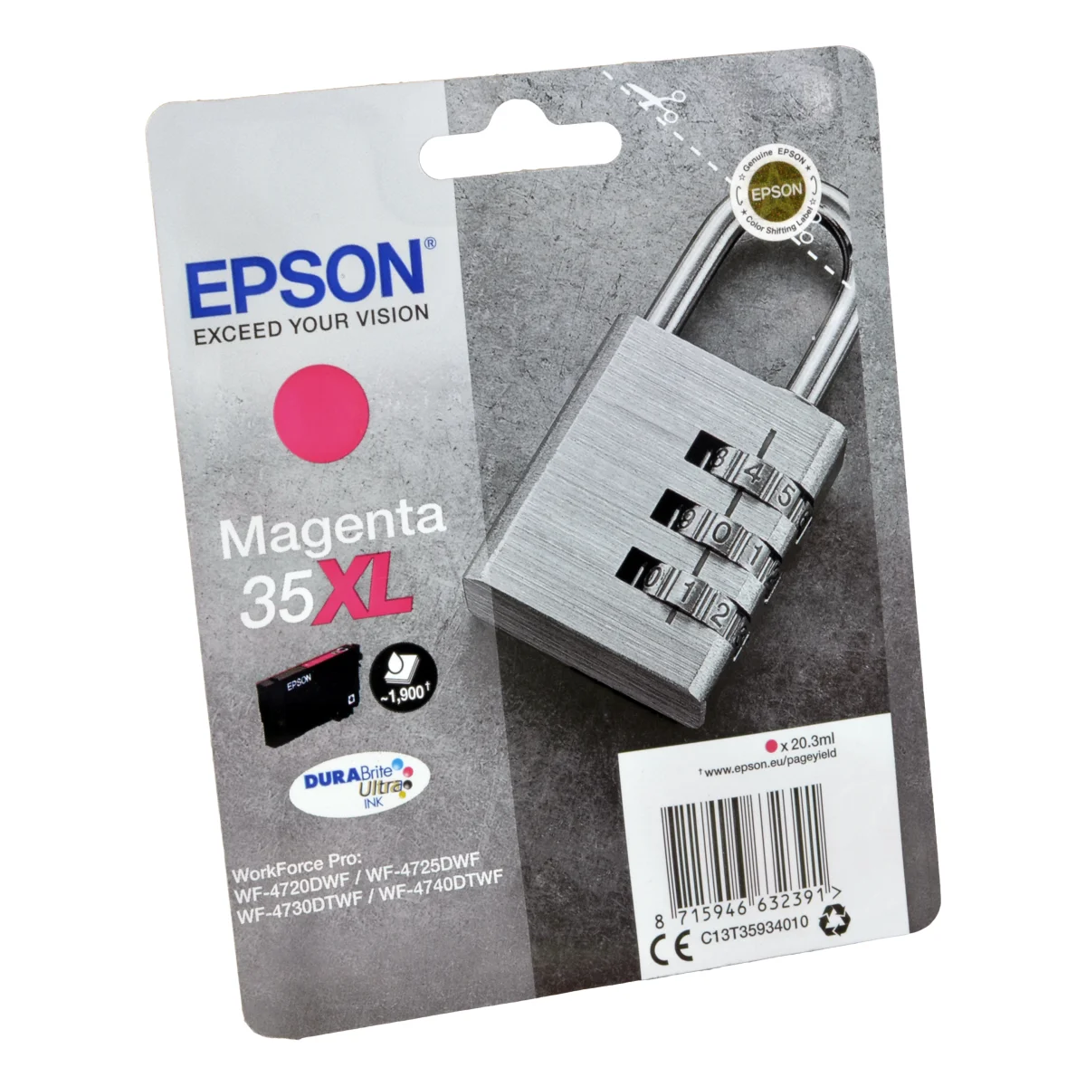 Epson Padlock Singlepack Magenta 35XL DURABrite Ultra Ink. Typ: Original, Tintentyp: Tinte auf Pigmentbasis, Druckfarben: Magenta. Verpackungsbreite: 145 mm, Verpackungstiefe: 33 mm, Verpackungshöhe: 120 mm. Menge pro Palette: 2400 Stück(e), Breite des Versandkartons: 12 cm, Länge des Versandkartons: 26 cmGeringere Druckkosten