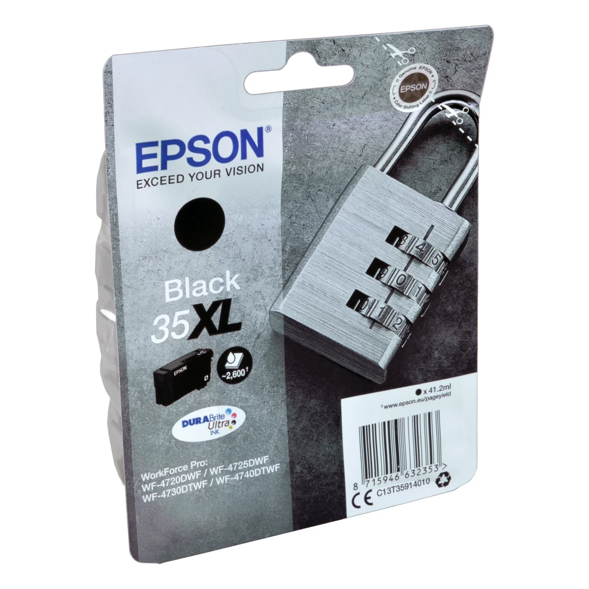 Epson Padlock Singlepack Black 35XL DURABrite Ultra Ink. Typ: Original, Tintentyp: Tinte auf Pigmentbasis, Druckfarben: Schwarz. Verpackungsbreite: 145 mm, Verpackungstiefe: 43 mm, Verpackungshöhe: 120 mm. Menge pro Palette: 1800 Stück(e), Breite des Versandkartons: 12 cm, Länge des Versandkartons: 26 cmGeringere Druckkosten