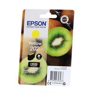 Epson Kiwi Singlepack Yellow 202 Claria Premium Ink. Typ: Original, Tintentyp: Tinte auf Pigmentbasis, Druckfarben: Gelb. Verpackungsbreite: 30 mm, Verpackungstiefe: 142 mm, Verpackungshöhe: 100 mm. Palettenbreite: 80 cm, Palettenlänge: 120 cm, Palettenhöhe: 2 mSenken Sie Ihre Druckkosten
