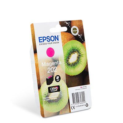 Epson Kiwi Singlepack Magenta 202 Claria Premium Ink. Typ: Original, Tintentyp: Tinte auf Pigmentbasis, Druckfarben: Magenta. Verpackungsbreite: 30 mm, Verpackungstiefe: 142 mm, Verpackungshöhe: 100 mm. Palettenbreite: 80 cm, Palettenlänge: 120 cm, Palettenhöhe: 2 mSenken Sie Ihre Druckkosten