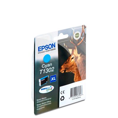 Epson Stag Singlepack Cyan T1302 DURABrite Ultra Ink. Typ: Original, Druckfarben: Cyan, Markenkompatibilität: Epson. Verpackungsbreite: 145 mm, Verpackungstiefe: 32 mm, Verpackungshöhe: 102 mm. Palettenbreite: 80 cm, Palettenlänge: 120 cm, Palettenhöhe: 60 cmNiedrigere Druckkosten dank XL-Tintenpatronen