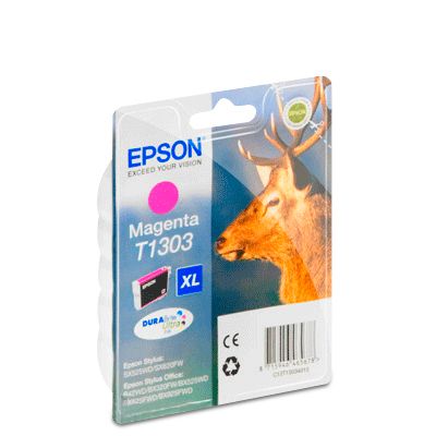 Epson Stag Singlepack Magenta T1303 DURABrite Ultra Ink. Typ: Original, Tintentyp: Tinte auf Pigmentbasis, Druckfarben: Magenta. Verpackungsbreite: 145 mm, Verpackungstiefe: 32 mm, Verpackungshöhe: 102 mm. Palettenbreite: 80 cm, Palettenlänge: 120 cm, Palettenhöhe: 60 cmNiedrigere Druckkosten dank XL-Tintenpatronen