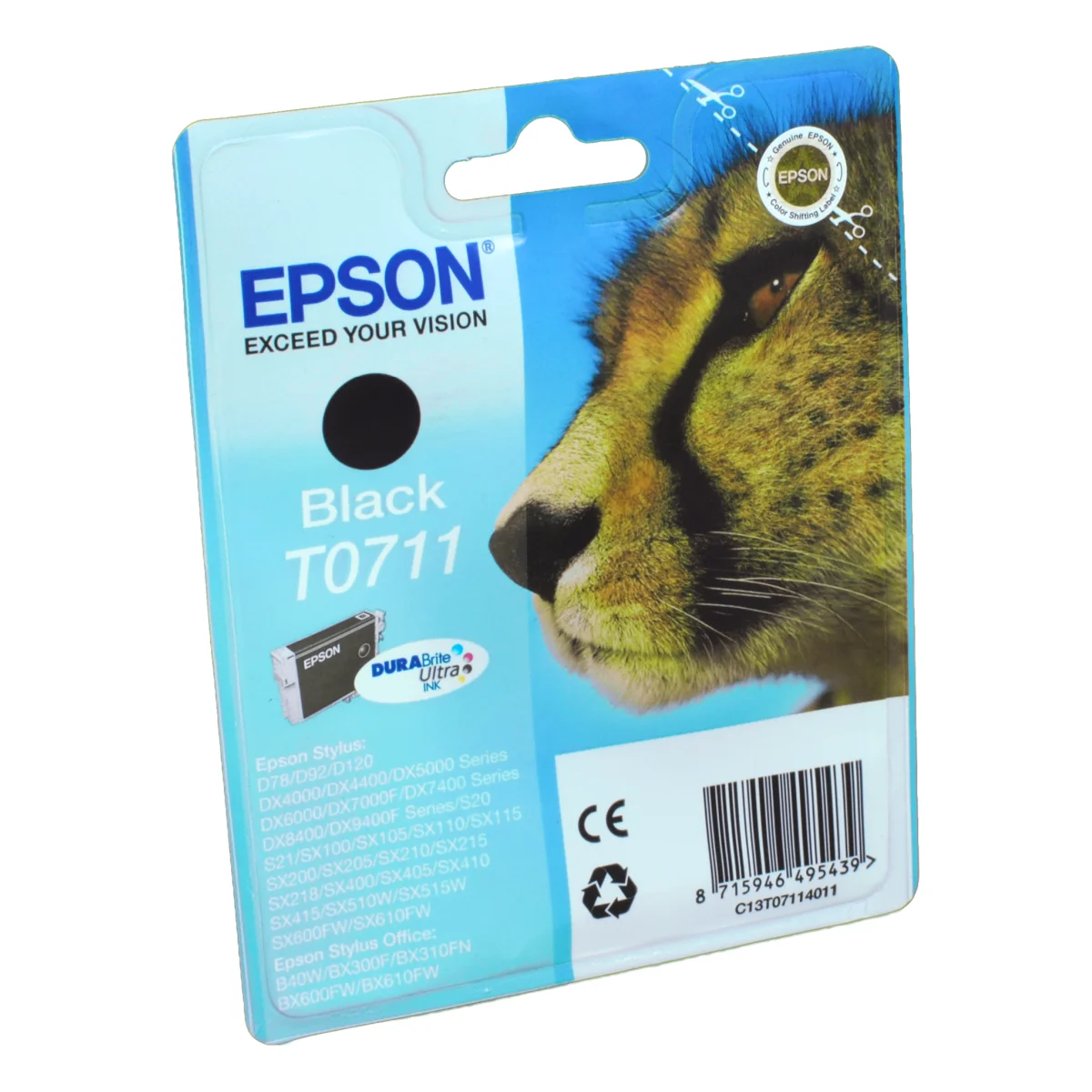 Epson Cheetah Singlepack Black T0711 DURABrite Ultra Ink. Typ: Original, Tintentyp: Tinte auf Pigmentbasis, Druckfarben: Schwarz. Verpackungsbreite: 145 mm, Verpackungstiefe: 26 mm, Verpackungshöhe: 102 mm. Palettenbreite: 80 cm, Palettenlänge: 120 cm, Palettenhöhe: 15 cmGeld sparen mit separaten Einzelpatronen