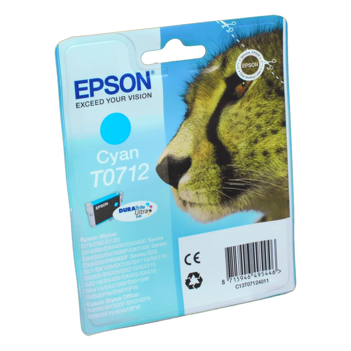 Epson Singlepack Cyan T0712 DURABrite Ultra Ink. Typ: Original, Druckfarben: Cyan, Markenkompatibilität: Epson. Verpackungsbreite: 145 mm, Verpackungstiefe: 26 mm, Verpackungshöhe: 102 mm. Palettenbreite: 80 cm, Palettenlänge: 120 cm, Palettenhöhe: 15 cmGeld sparen mit separaten Einzelpatronen