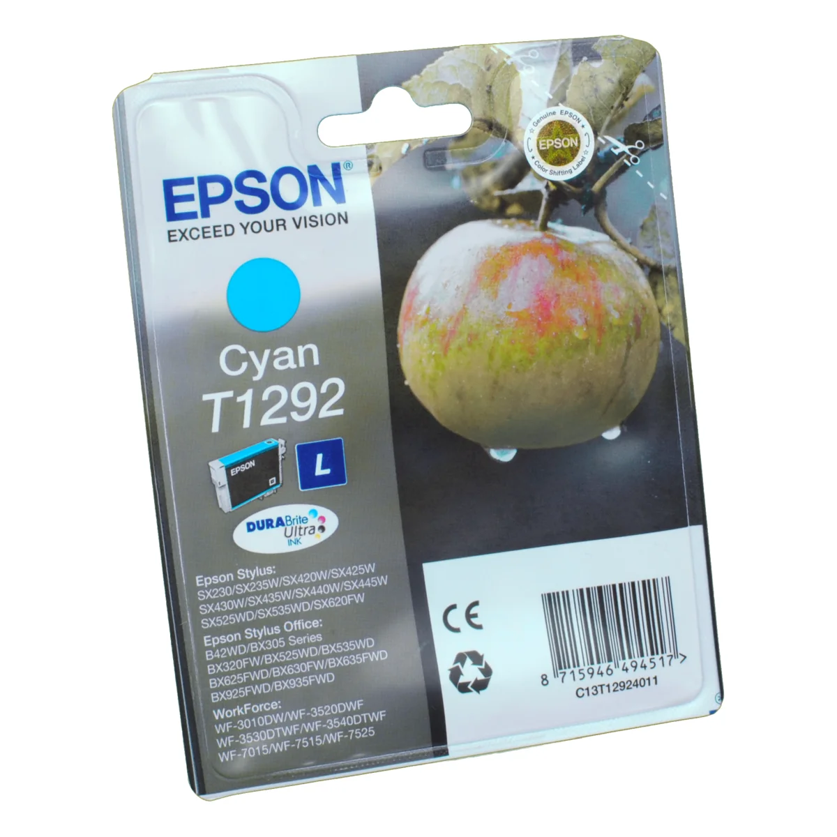 Epson Singlepack Cyan T1292 DURABrite Ultra Ink. Typ: Original, Druckfarben: Cyan, Markenkompatibilität: Epson. Verpackungsbreite: 145 mm, Verpackungstiefe: 26 mm, Verpackungshöhe: 102 mm. Palettenbreite: 80 cm, Palettenlänge: 120 cm, Palettenhöhe: 15 cmGeld sparen mit separaten Einzelpatronen
