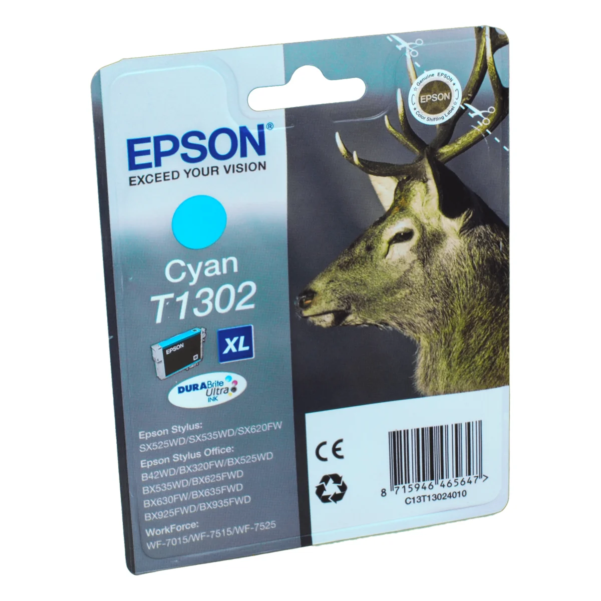 Epson Stag Singlepack Cyan T1302 DURABrite Ultra Ink. Typ: Original, Druckfarben: Cyan, Markenkompatibilität: Epson. Verpackungsbreite: 145 mm, Verpackungstiefe: 32 mm, Verpackungshöhe: 102 mm. Palettenbreite: 80 cm, Palettenlänge: 120 cm, Palettenhöhe: 60 cmNiedrigere Druckkosten dank XL-Tintenpatronen