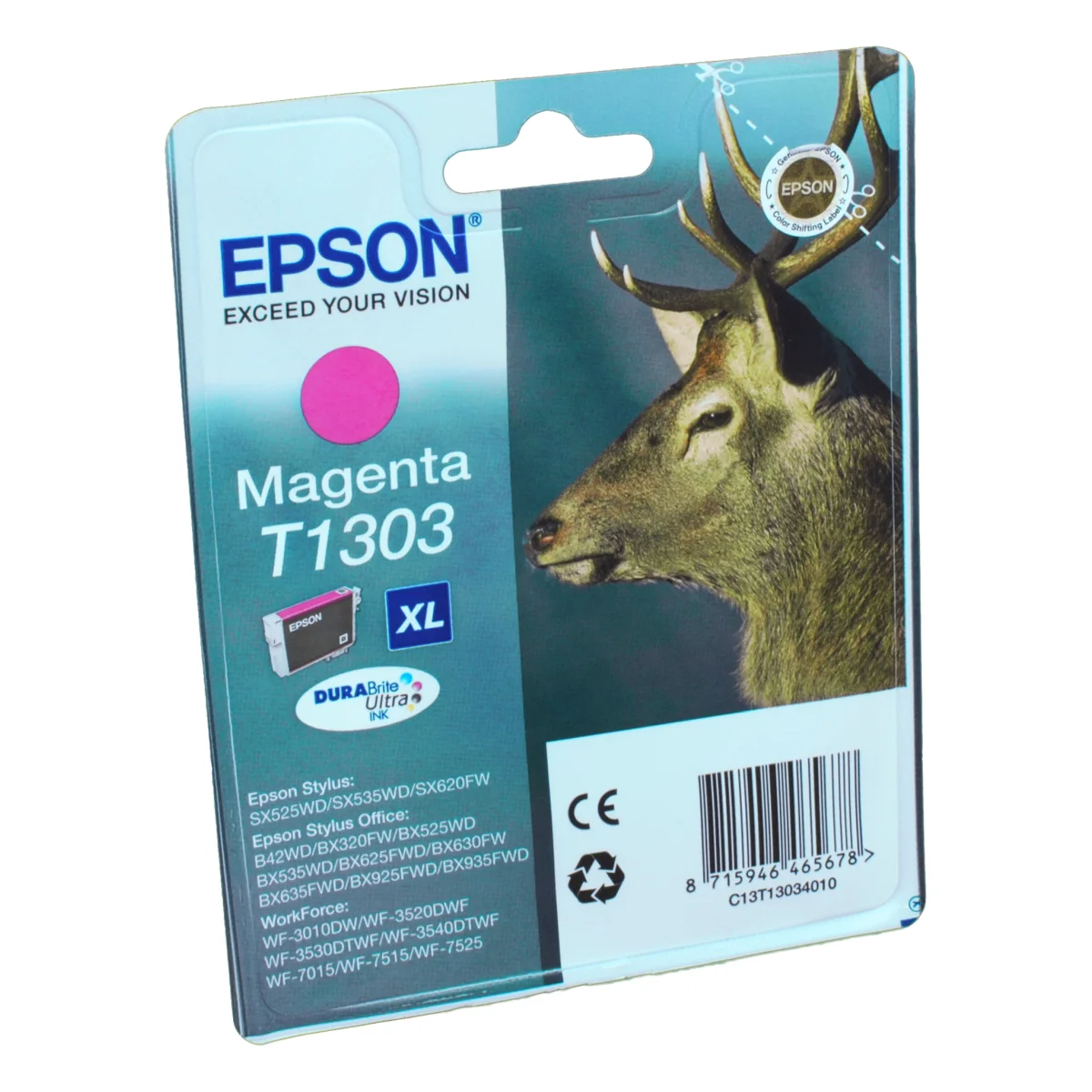 Epson Stag Singlepack Magenta T1303 DURABrite Ultra Ink. Typ: Original, Tintentyp: Tinte auf Pigmentbasis, Druckfarben: Magenta. Verpackungsbreite: 145 mm, Verpackungstiefe: 32 mm, Verpackungshöhe: 102 mm. Palettenbreite: 80 cm, Palettenlänge: 120 cm, Palettenhöhe: 60 cmNiedrigere Druckkosten dank XL-Tintenpatronen