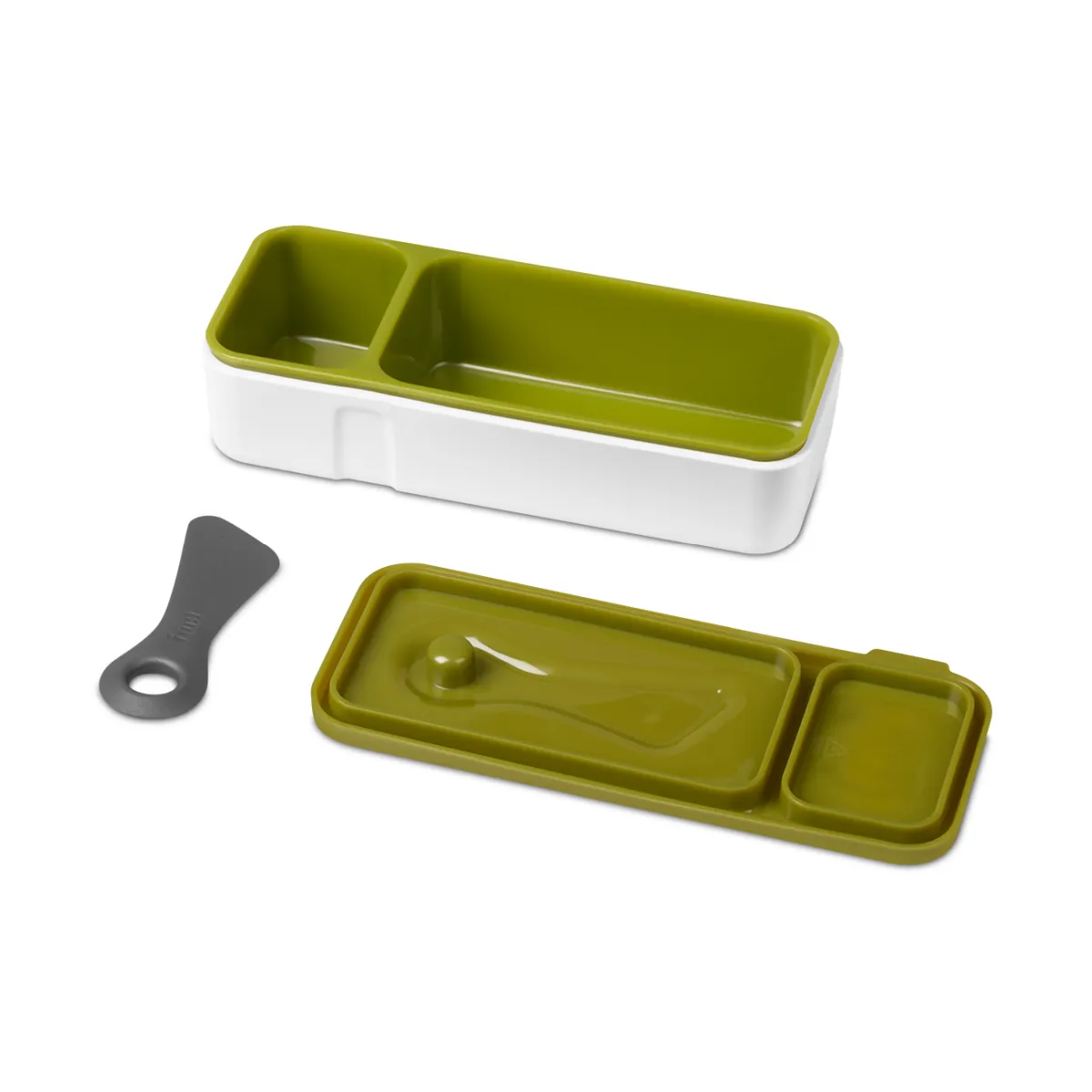 Der Trudeau Fuel Snack'N Dip Container ist die ideale Lösung für alle, die ihre Snacks und Dips unterwegs genießen möchten. Mit seinem durchdachten 2-Kammer-Design bietet er Platz für gesunde Snacks wie Gemüsesticks, Cracker oder Obst sowie passende Dips wie Hummus, Joghurt oder Erdnussbutter. Dank des integrierten Aufstrichmessers, der sicher im Deckel verstaut ist, haben Sie stets das passende Werkzeug zur Hand.Produktmerkmale:
